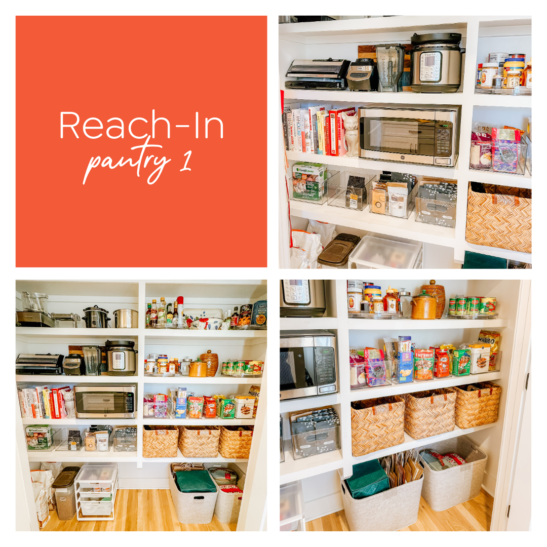 You have a decent-sized reach-in pantry with enough shelf space to mix baskets + clear bins. This type of layout is ideal because it gives you room to create clear categories while still keeping everything easy to grab.